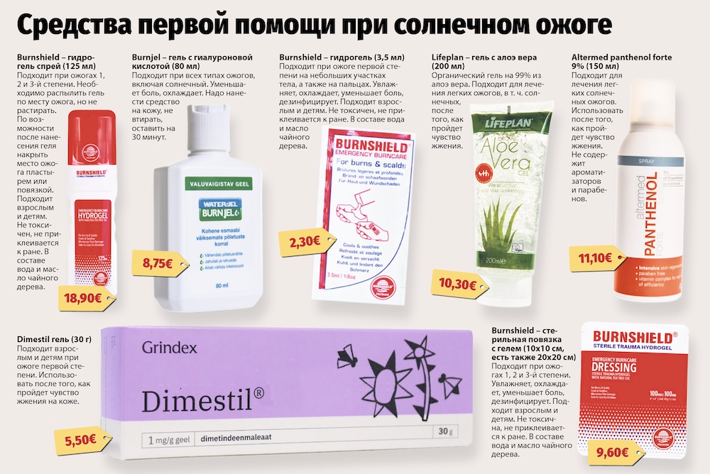 Пантенол, алоэ-гель и специальные средства после загара можно использовать, только когда спадёт чувство жжения на коже. Можно принять болеутоляющее средство, например, ибупрофен или парацетамол.