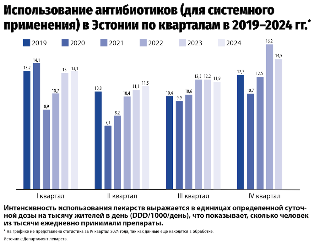 По всей Европе в этот период (2020–2021) использование антибиотиков значительно снизилось, в Эстонии – примерно на 11–14%. Если сравнивать постпандемийные годы (2022–2023) с допандемийным периодом (2019), можно отметить увеличение потребления антибиотиков примерно на 5–8% в год.