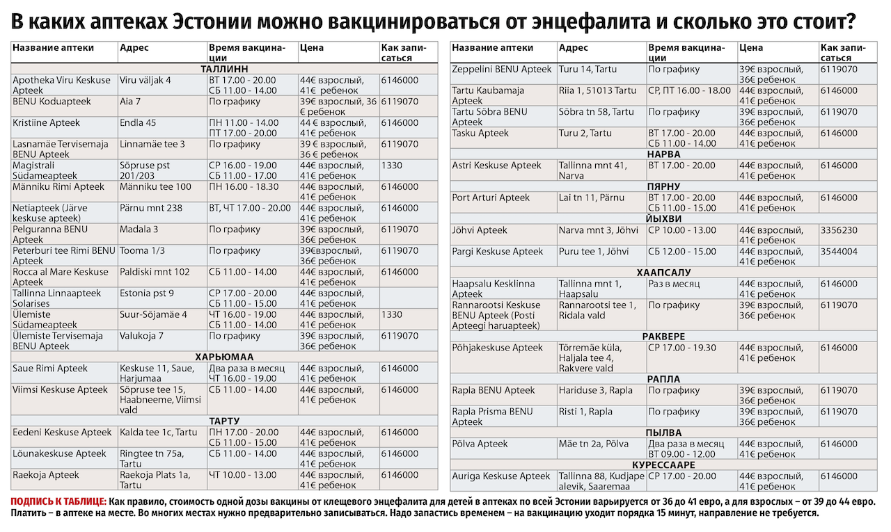 Близится теплый сезон, и сейчас – уже самое время, чтобы начать защищаться от связанных с ним опасностей. Весной в 34 аптеках Эстонии можно вакцинироваться от клещевого энцефалита. «МК-Эстония» выяснила, в каких конкретно аптеках можно сделать прививку, которая поможет избежать энцефалита, и сколько это стоит?