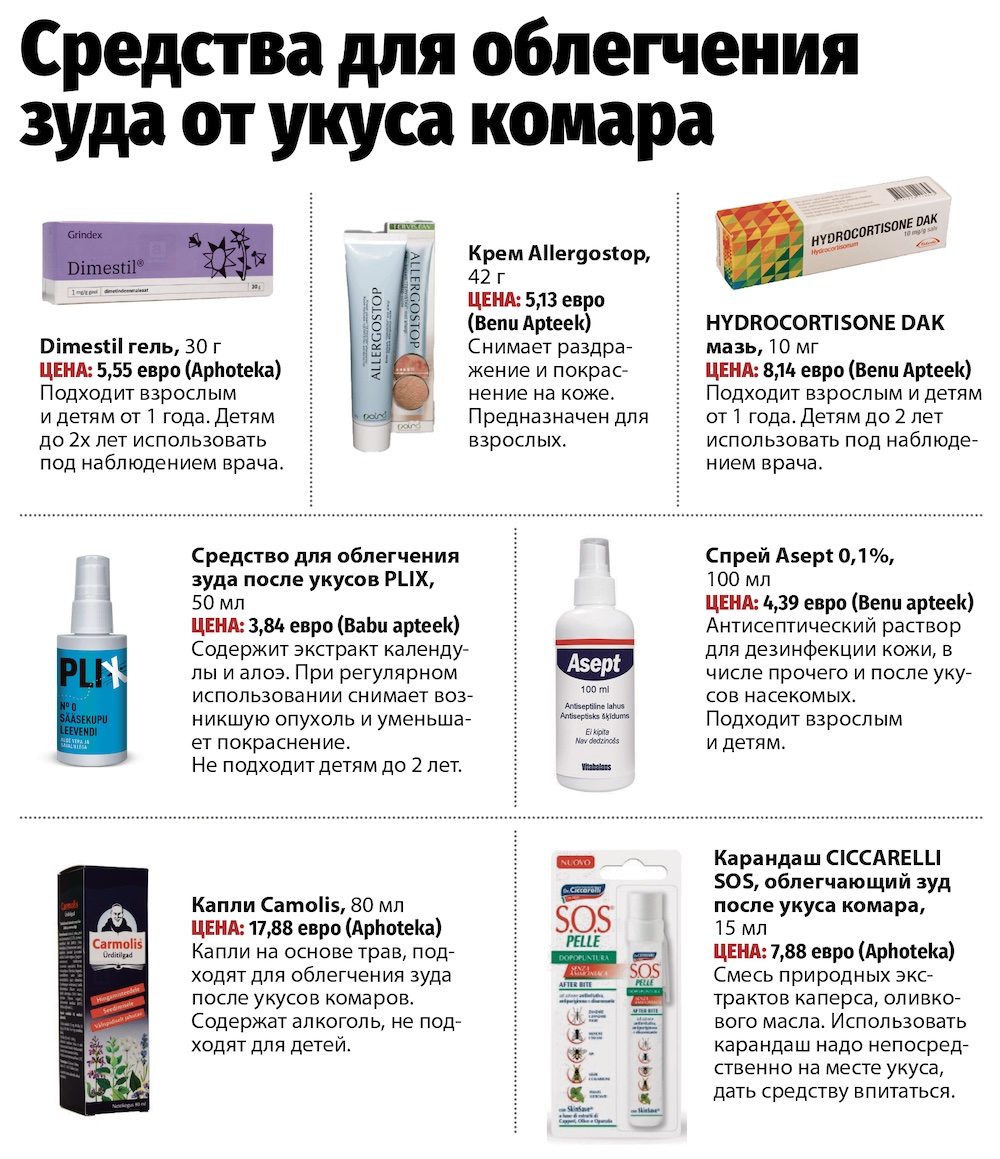 «Также хорошо себя зарекомендовал гель Dimestil. Препарат содержит активное вещество dimetindeenmaleaat, относящееся к группе лекарств, называемых антигистаминными средствами, которые применяют для снятия кожной аллергии и зуда различного происхождения. Он быстро снимает зуд – в течение нескольких минут. Гель можно использовать взрослым и детям в возрасте от 1 месяца для временного облегчения зуда, вызванного кожными реакциями, такими как сыпь, крапивница, и укусами насекомых. Максимально можно использовать 7 дней, – говорит провизор. – Allergostop тоже можно попробовать тем, кто боится использовать гормональную мазь. Капли Carmolis также можно использовать как мазь на месте укуса. А если поставить их ненадолго в холодильник, будет еще и охлаждающий эффект».