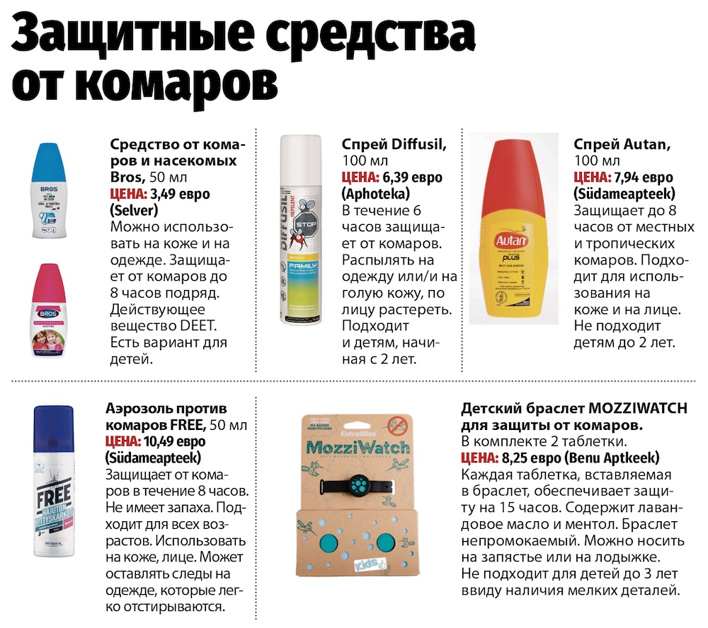 «Autan, Diffusil – эффективные химические отпугиватели комаров и клещей. По сравнению с DEET, их действующее вещество икаридин, он не так вреден для водных животных и других насекомых. Инсектицидные средства, содержащие это вещество, можно распылять и на одежду – оно не повлияет на окраску ткани. Однако продукты, содержащие икаридин, не подходят для младенцев и детей младше 2 лет», – добавляет Маргот Лехари.
