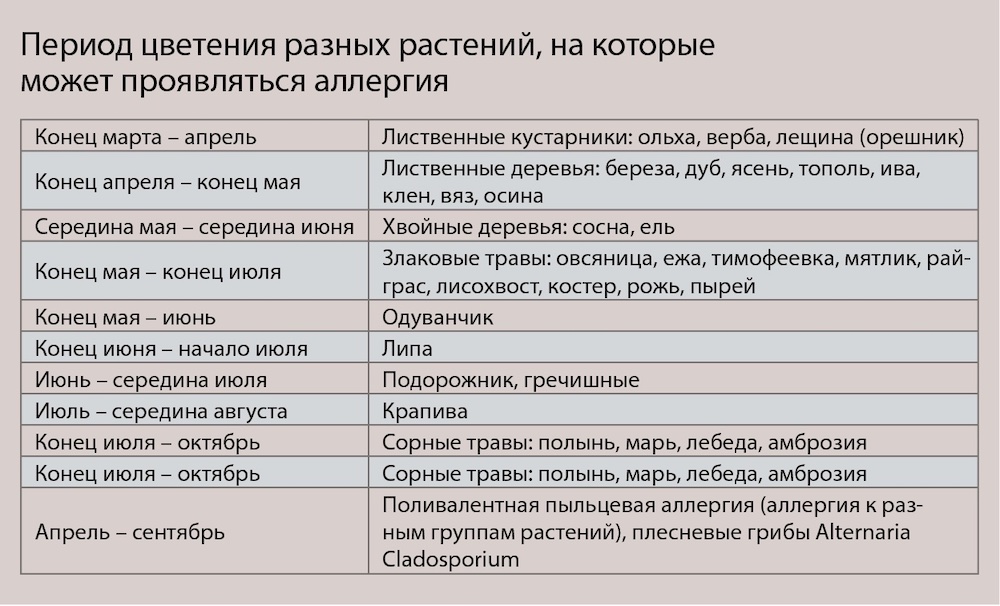 Аллергия на пыльцу начинает проявляться уже с конца марта–начала апреля и, как правило, продолжается в течение всего периода вегетации. Это хроническое заболевание наиболее активно проявляется в определенные периоды года: в весенний – с апреля по май; в весенне-летний – с мая по август; в осенний – с августа по октябрь.