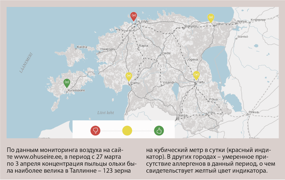 На сайте www.ohuseire.ee оценивается качество воздуха по всей стране. На интерактивной карте отмечены те или иные аллергены, активные в разных городах Эстонии. Для мониторинга образцы пыльцы отбирают в специальные пробоотборники, анализируют и подсчитывают с помощью микроскопа каждый рабочий день. Результаты анализа ежедневно передаются в базу данных.